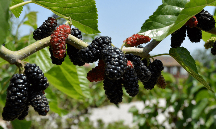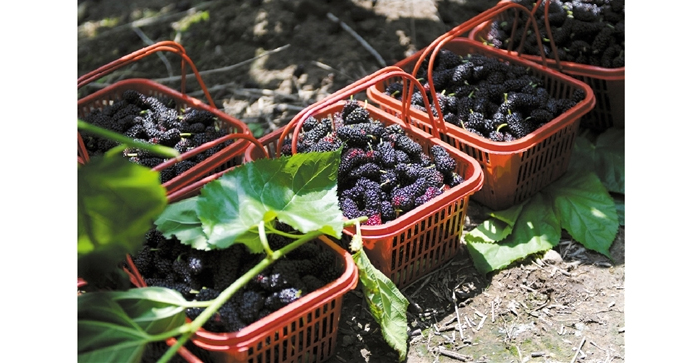 桑果完全成熟后,就可以采摘了,挑出果梗、果叶,用成熟度高的桑果酿出来的酒甜度要高一些,口感也愈加纯正。